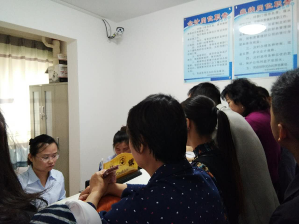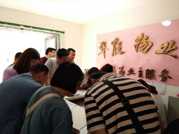 經(jīng)過(guò)各部門領(lǐng)導(dǎo)的精心帶領(lǐng)下及各單位同事的幫忙努力下一天的工作終于落幕,順利收房82戶。(圖為前臺(tái)收房及收費(fèi)室) 石婷
